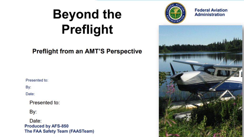 FAA Safety Team (FAAST) presentation on preflight techniques from an aircraft mechanic’s perspective, including applying pressure to controls, inspecting fuel cap latches, checking for loose rivets, etc..